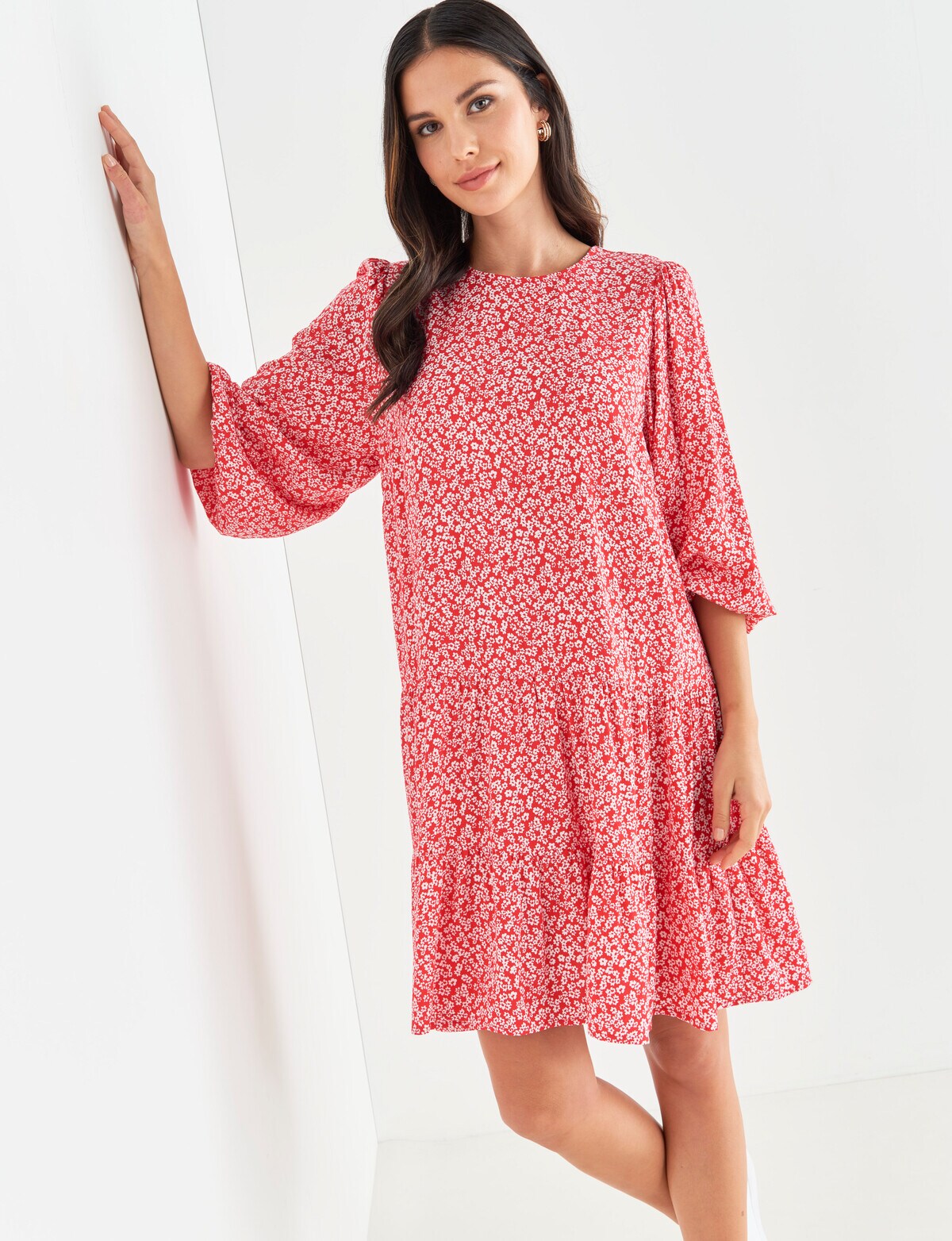 Whistle Ditsy 3 4 Sleeve Drop Hem Dress Red White Dresses